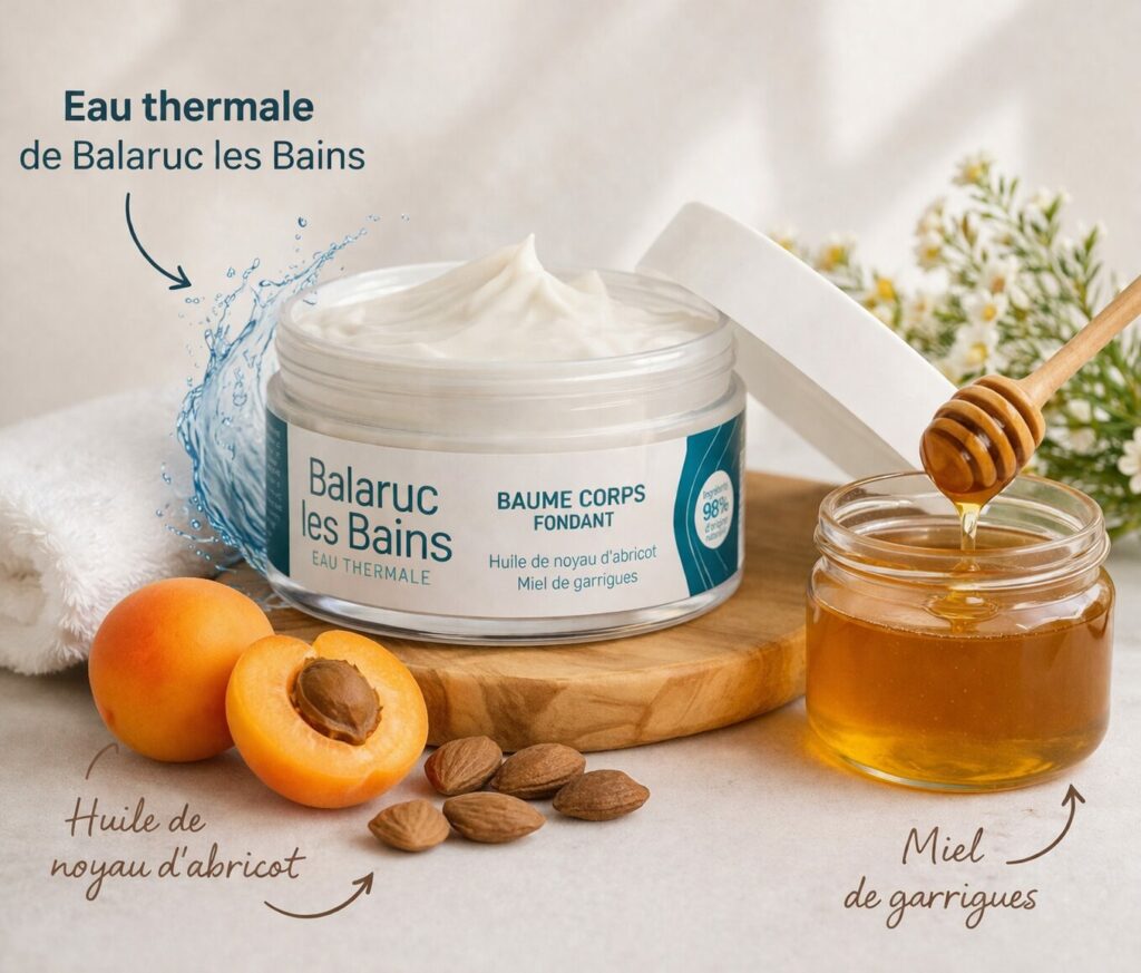 Le Baume Corps Fondant Balaruc-les-Bains Eau thermale est un soin nourrissant à la texture fondante et au parfum gourmand. Il apporte un confort immédiat à toutes les peaux, même les plus sèches, et laisse la peau douce, veloutée et durablement hydratée. Sa texture fondante pénètre rapidement sans laisser de film gras, pour un fini satiné et un mieux-être au quotidien.