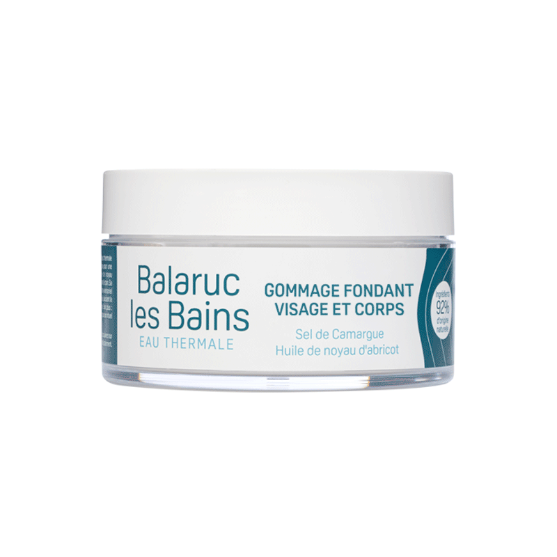 Ce gommage fondant est un doux mélange d’eau thermale régénérante et protectrice, de Sel de Camargue pour une exfoliation cristalline et naturelle et d’Huile de noyau d’abricot pour une peau nourrie et protégée durant le soin. Sa texture gourmande laisse place à un rinçage ultra sensoriel car le sel fond au contact de l’eau en un clin d’œil, laissant la peau douce, satinée et délicatement parfumée.